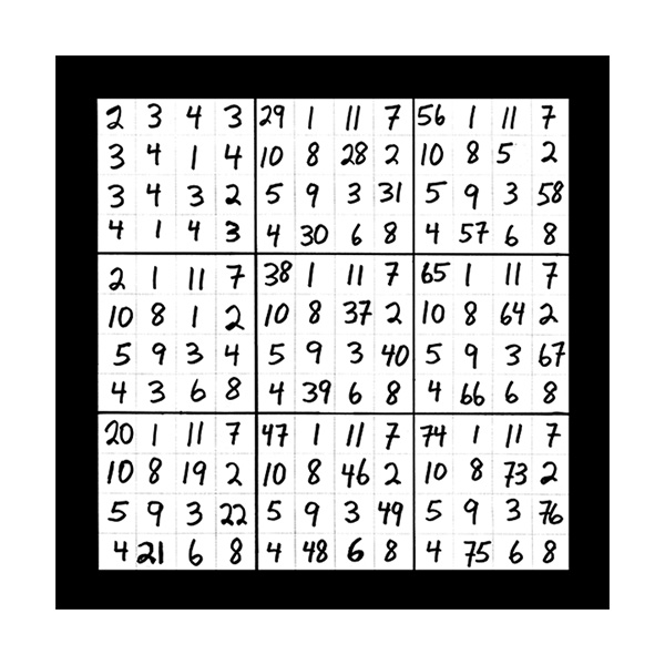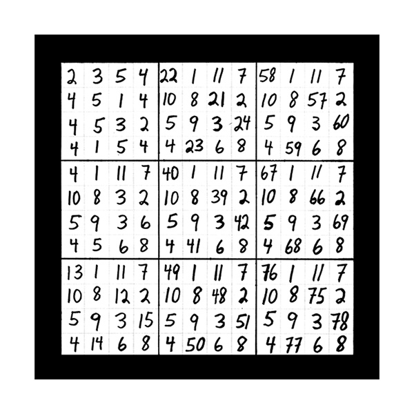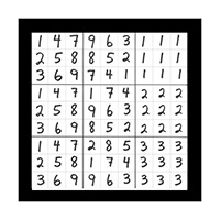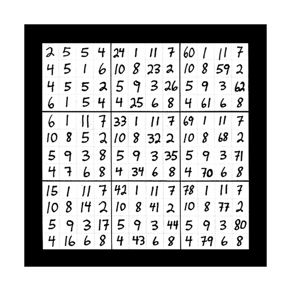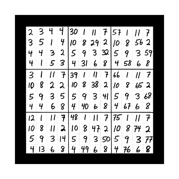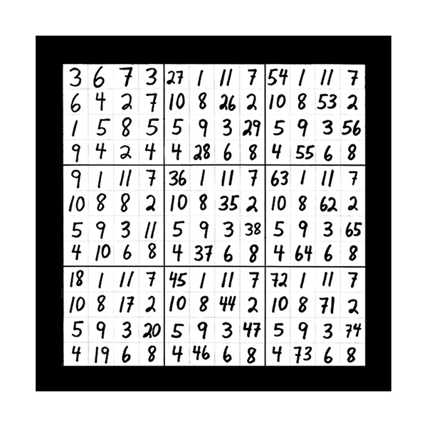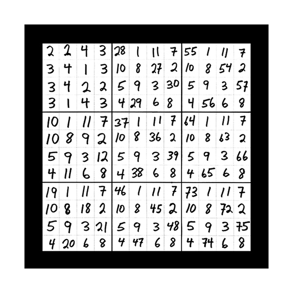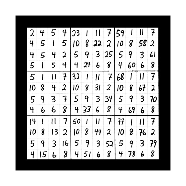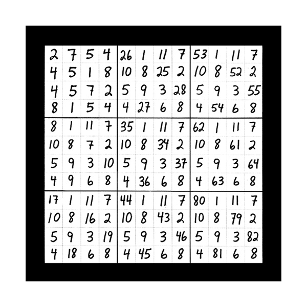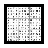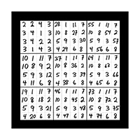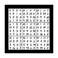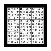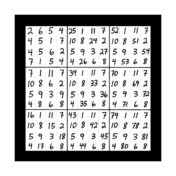 The third section of numerical imagery reveals 3 images which will help to explain the intricacies of the previous 2 sections with additional follow up details. In this first image of section 3 is a grouping of 9 double digit magic squares that will add up to the sums of 3, 6, or 9 in the singe digit. When you look at the first inner square at the top left corner you will see the 9 double digit variations of number 1 as in 19, 28, 37, 46, 55, 64, 73, 82 and 91. This smaller inner square is the same as the larger double digit magic square that was witnessed in the third image of the first section of 3 images. This first image of section 3 also represents all 9 possible double digit variations of all 9 matrix magic square images contained in section 2. The middle left inner square of this first image in section 3 holds the 9 possible variations of the number 2 in the double digit as in 11, 29, 38, 47, 56, 65, 74, 83 and 92. The lower left grid contains the 9 possible combinations of the number 3 as in 12, 21, 39, 48, 57, 66, 75, 84 and 93. The upper middle magic square houses the 9 possible double digit variations of the number 4 as in 13, 22, 31, 49, 58, 67, 76, 85 and 94. In the centre magic square are the double digit combinations of the number 5 as in 14, 23, 32, 41, 59, 68, 77, 86 and 95. The lower middle grid contains the 9 double digit variations of the number 6 as in 15, 24, 33, 42, 51, 69, 78, 87 and 96. The upper right magic square houses the 9 possible double digit variations of the number 7 as in 16, 25, 34, 43, 52, 61, 79, 88 and 97. The middle right chamber contains the 9 possible variations of the number 8 as in 17, 26, 35, 44, 53, 62, 71, 89 and 98. And finally the lower right inner magic square houses the 9 possible double digit combinations of the number 9 as in 18, 27, 36, 45, 54, 63, 72, 81 and 99.